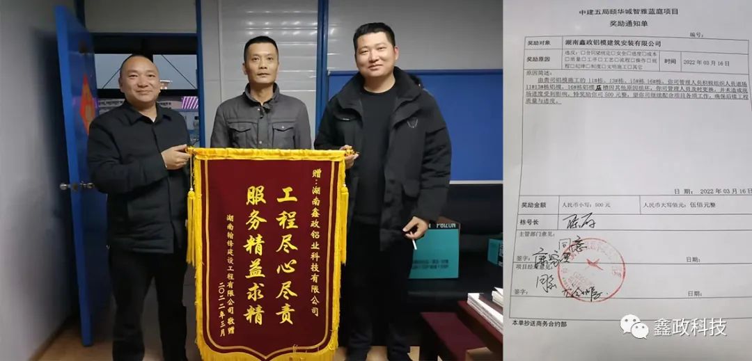 榮譽源自信任,信任源自擔當。錦旗既是對鑫政集團的鼓勵也是一種鞭策,集團未來將繼續以優質服務貫穿始終,以客戶需求為導向,以客戶滿意為目標,進一步完善現場技術服務體系,提升技術服務人員專業能力,切實保障項目進度高效執行,讓客戶樂享“鑫”服務,為客戶創造“鑫”價值,與客戶共創“鑫”輝煌。